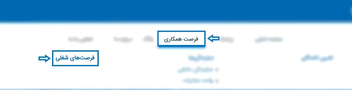 پس از ورود به سایت اصلی شرکت، همانند تصویر زیر از نوار بالای صفحه بر روی گزینه "فرصت همکاری" کلیک کرده و از بین گزینههای موجود، روی گزینه "فرصتهای شغلی" کلیک نمایید.