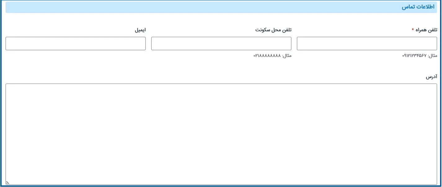 در این بخش، باید اطلاعات تماس شامل تلفن همراه، تلفن محل سکونت، و آدرس محل سکونت خود را وارد نمایید.