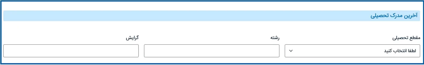 در این بخش، باید مقطع تحصیلی خود را از بین گزینه های موجود انتخاب نموده و رشته و گرایش خود را وارد نمایید.