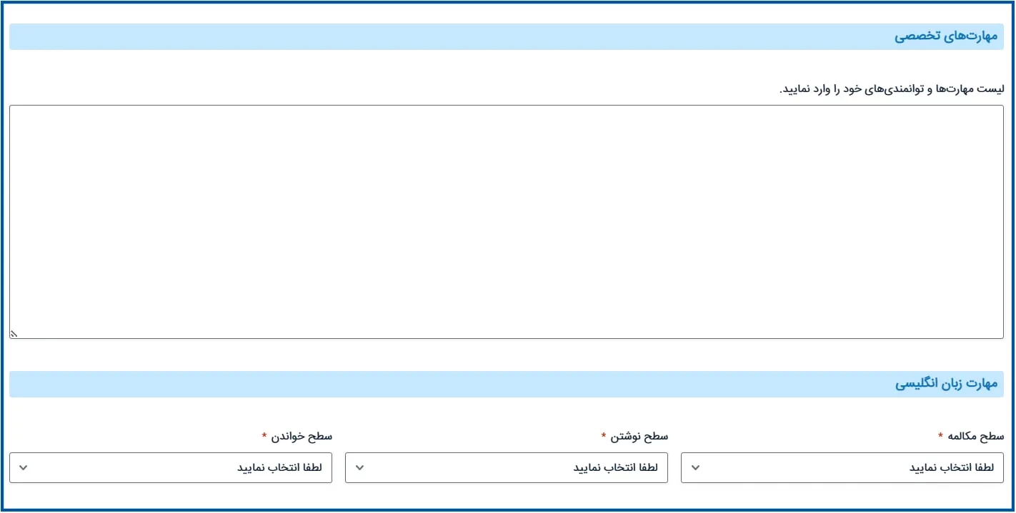 در این بخش، مهارتها و توانمندیهای خود را وارد نمایید. سپس سطح مکالمه، سطح خواندن و سطح نوشتن خود در زبان انگلیسی را از بین گزینههای مربوط به هر فیلد انتخاب کنید.