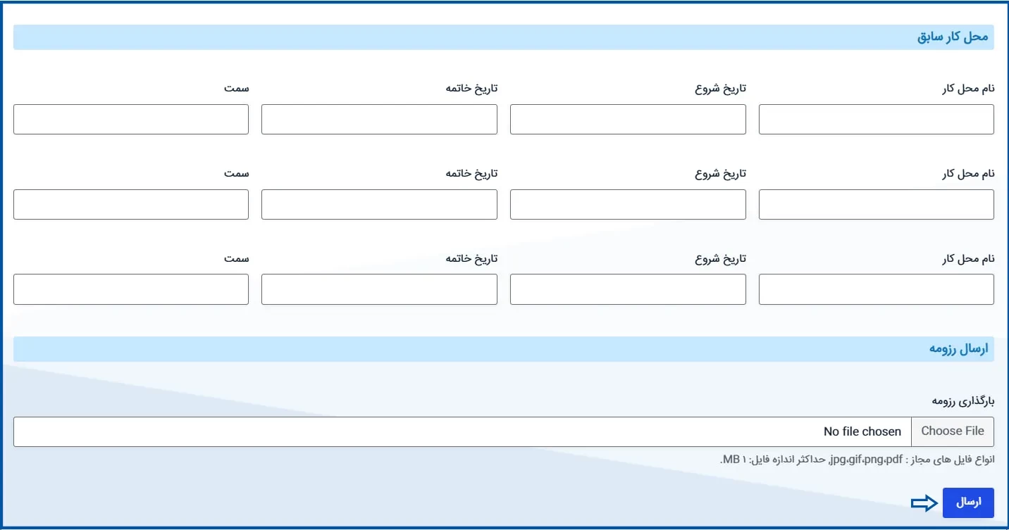 در این بخش، باید نام محل کار، سمت، تاریخ شروع و تاریخ خاتمه سوابق کاری خود را وارد نمایید. در نهایت، رزومه خود را در فیلد مربوطه بارگذاری کرده و روی گزینه "ارسال" کلیک نمایید.