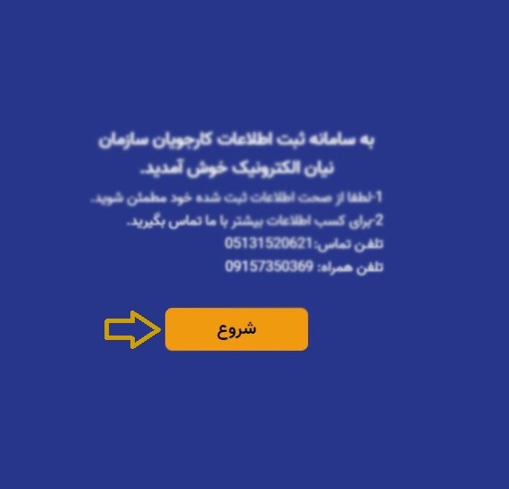 بخش اول: در این مرحله، پس از ورود به سامانه ثبت اطلاعات کارجویان شرکت نیان الکترونیک، شما با صفحه خوشآمدگویی مواجه میشوید. برای شروع فرآیند ثبت اطلاعات، روی دکمه زرد رنگ "شروع" کلیک کنید.