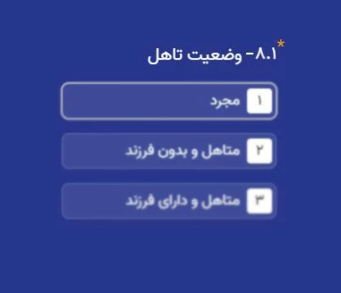 در این مرحله که شامل سه گزینه 1- مجرد، 2- متاهل و بدون فرزند، 3- متاهل و دارای فرزند است، باید وضعیت تأهل خود را انتخاب نمایید.