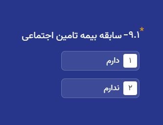 در این بخش، وضعیت سابقه بیمه تأمین اجتماعی خود را باید تعیین کنید. دو گزینه برای انتخاب وجود دارد: 1- دارم 2- ندارم. اگر سابقه بیمه تأمین اجتماعی دارید، گزینه "دارم" را انتخاب کنید. اگر تاکنون تحت پوشش بیمه تأمین اجتماعی نبودهاید، گزینه "ندارم" را انتخاب کنید.