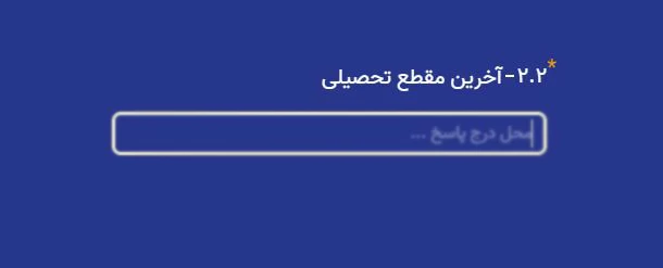 در دومین مرحله از بخش دوم فرم استخدام، لازم است "آخرین مقطع تحصیلی" خود را وارد نمایید. در کادر مشخص شده، مقطع تحصیلی خود را تایپ کنید. به عنوان مثال: دیپلم، کارشناسی، کارشناسی ارشد، یا دکتری.