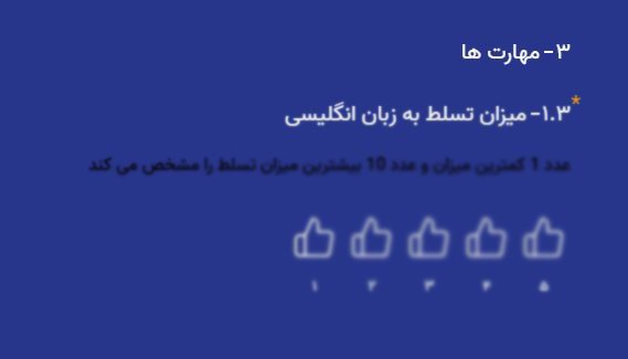 در اولین مرحله از بخش سوم فرم استخدام، باید "میزان تسلط به زبان انگلیسی" خود را مشخص کنید. در این بخش، میزان تسلط خود را از عدد 1 تا 5 ارزیابی کنید، که عدد 1 نشاندهنده کمترین میزان تسلط و عدد 5 بالاترین سطح تسلط را نشان میدهد. برای انتخاب سطح مهارت، روی علامتهای لایک (👍) که به صورت پلهای از 1 تا 5 قرار گرفتهاند، کلیک کنید.