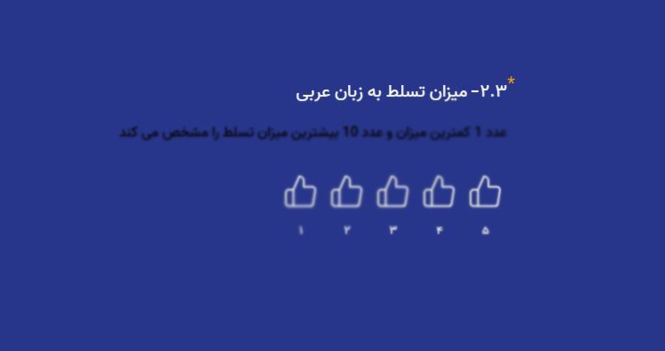 در دومین مرحله از بخش سوم فرم استخدام، باید "میزان تسلط به زبان عربی" خود را تعیین نمایید. مشابه مرحله قبل، سطح مهارت خود را از عدد 1 تا 5 بر اساس میزان تسلط مشخص کنید. برای انتخاب، روی علامتهای لایک (👍) کلیک کنید. هر علامت لایک، یک سطح از میزان تسلط را نشان میدهد.