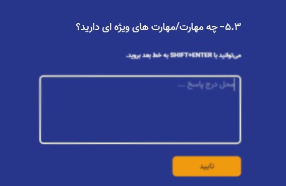 در این مرحله باید به این سوال پاسخ دهید که "چه مهارتها یا مهارتهای ویژهای دارید؟". در کادر متنی، میتوانید مهارتهای فنی، حرفهای، یا نرمافزارهای تخصصی را که در آنها تسلط دارید، وارد کنید. به عنوان مثال: مهارت در برنامهنویسی (Java, Python)، تسلط بر ابزارهای تحلیل داده (Tableau, SPSS)، یا مهارتهای خاص مدیریتی و رهبری.