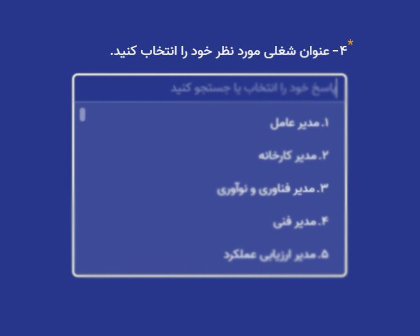 در این مرحله از فرم استخدام، باید "عنوان شغلی مورد نظر" خود را از میان گزینههای موجود انتخاب نمایید. از فهرست کشویی ارائه شده، عنوان شغلی دلخواه خود را انتخاب کنید. برای مثال: مدیر عامل، مدیر کارخانه، مدیر فناوری و نوآوری، مدیر فنی و..