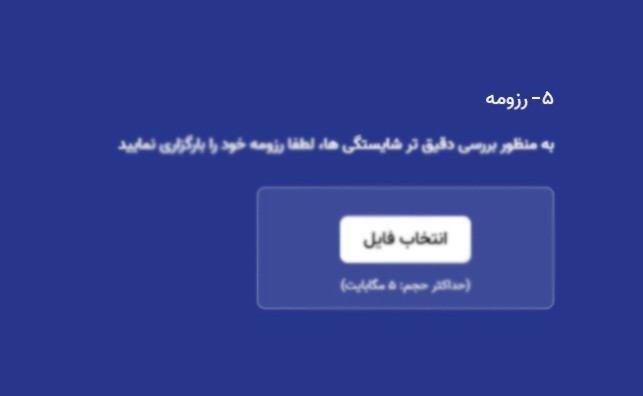 در این مرحله، باید فایل رزومه خود را بارگذاری نمایید. رزومه شما شامل جزئیات تحصیلات، تجربیات کاری، مهارتها و تواناییهایی است که میتواند به ارزیابی بهتر کارفرما کمک کند. روی دکمه "انتخاب فایل" کلیک کنید و فایل رزومه خود را از دستگاه انتخاب کنید. دقت داشته باشید که حداکثر حجم مجاز برای فایل رزومه ۵ مگابایت است.