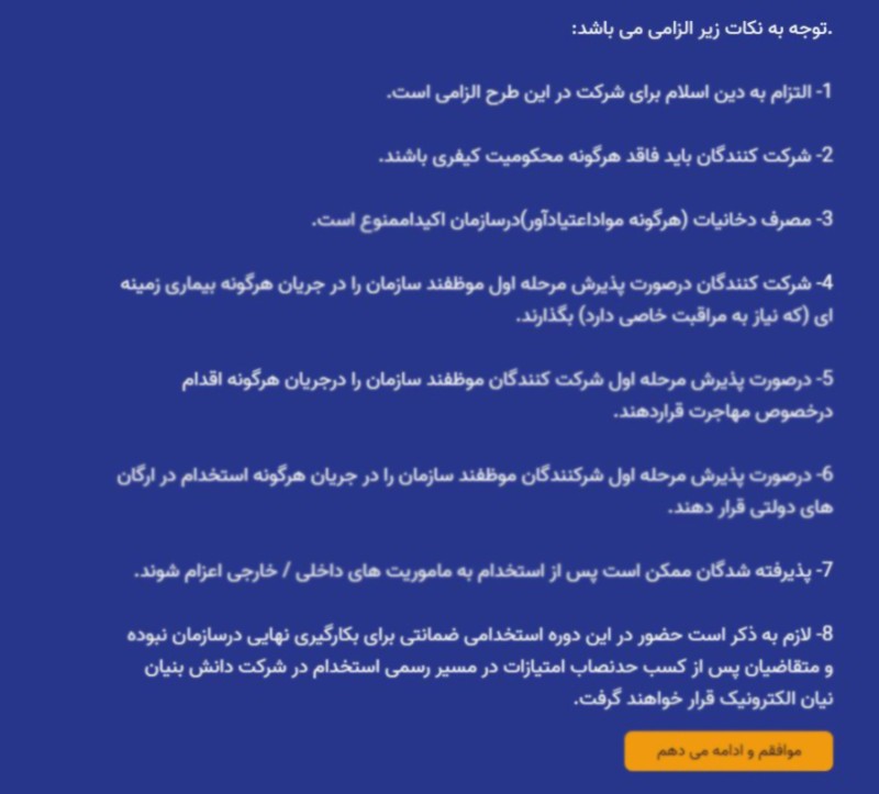 در این مرحله، نکات و شرایط الزامی شرکت نیان الکترونیک برای ادامه فرایند استخدامی نمایش داده شده است. این نکات شامل موارد مهمی است که متقاضیان باید آنها را رعایت کنند.