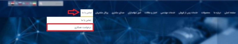 برای ورود به بخش درخواست همکاری در سایت نیان الکترونیک، ابتدا باید از منوی بالای صفحه، روی گزینه "تماس با ما" کلیک کنید. سپس در زیرمنوی باز شده، گزینه "درخواست همکاری" را انتخاب نمایید.