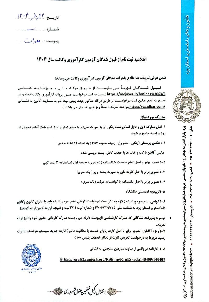 به اطلاع پذیرفته شدگان آزمون ورودی وکالت سال 1404 می رساند، از روز چهارشنبه مورخ 1404/11/01 لغايت روز شنبه مورخ 1404/11/11 با مراجعه به سايت نسبت به تكميل فرم و ارسال مدارك لازم جهت پیش ثبت نام مطابق راهنما اقدام نمايند.