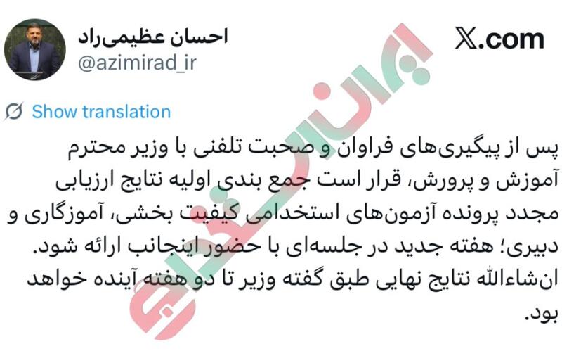 احسان عظیمی راد نماینده مردم مشهد، سخنگوی کمیسیون آموزش مجلس با انتشار توییتی در پیام رسان ایکس گفت: پس از پیگیریهای فراوان و صحبت تلفنی با وزیر محترم آموزش و پرورش، قرار است جمعبندی اولیه نتایج ارزیابی مجدد پرونده آزمونهای استخدامی کیفیت بخشی، آموزگاری و دبیری؛ هفته جدید در جلسهای با حضور اینجانب ارائه شود.