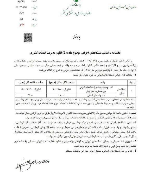 بخشنامه ساعت کاری دستگاه های اجرایی در دوره سرد سال ۱۴۰۴