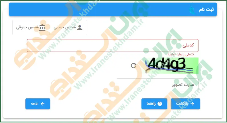 در این مرحله، باید حقیقی یا حقوقی بودن خود را انتخاب کرده، سپس کد ملی و عبارت موجود در تصویر را وارد کرده و روی دکمه "ادامه" کلیک نمایید.