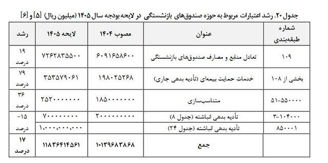 رشد ۱۷ درصدی اعتبارات پیشبینی شده برای صندوقهای بازنشستگی در لایحه بودجه سال آتی | رشد ۳۶ درصدی اعتبارات متناسبسازی
