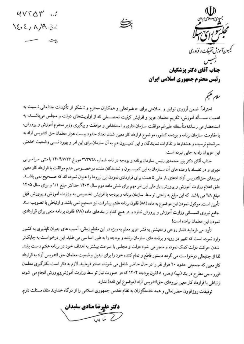 جناب آقای دکتر پزشکیان ریاست محترم جمهوری اسلامی ایران سلامعلیکم احتراماً؛ ضمن آرزوی توفیق و سلامتی برای حضرتعالی و همکاران محترم با عنایت به تأکیدات جنابعالی نسبت به اهمیت مسئلهآموزش، تکریم معلمان عزیز و افزایش کیفیت تحصیلی که از اولویتهای دولت و مجلس میباشد به استحضار میرساند متأسفانه در خصوص عدم تخصیص اعتبار برای تبدیل وضعیت معلمان حقالتدریس ،آزاد علیرغم موافقت سازمان اداری و استخدامی و پیگیری وزارت آموزشوپرورش با بی عملی و کارشکنی سازمان برنامهوبودجه کشور این مهم به سرانجام نرسیده و هشدارها و تذکرات به آن سازمان هم بلااثر مانده است.
