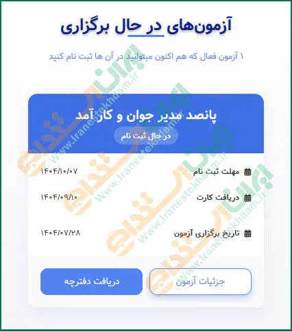در این مرحله، صفحه مشخصات آزمون نمایش داده میشود که لازم است روی گزینه "ثبت نام" کلیک نمایید.
