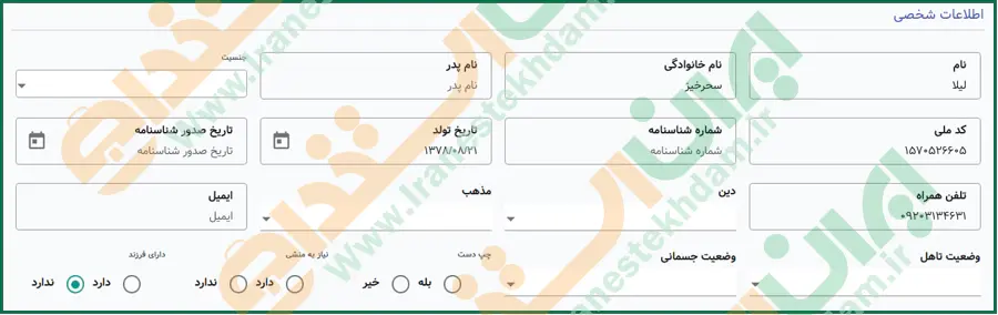 در این بخش لازم است اطلاعات هویتی خود شامل نام و نام خانوادگی، نام پدر، کدملی و.. را وارد نمایید.