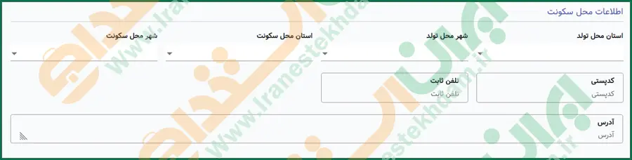 این بخش مربوط به اطلاعات محل سکونت است که باید در آن اطلاعاتی نظیر استان محل تولد و سکونت، شهر محل تولد و سکونت، کد پستی و.. را وارد نمایید.