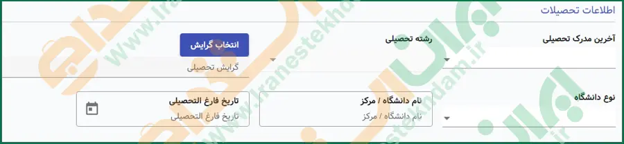 در این بخش باید اطلاعات سوابق تحصیلی خود، شامل آخرین مدرک تحصیلی، رشته تحصیلی، گرایش و.. را وارد نمایید.