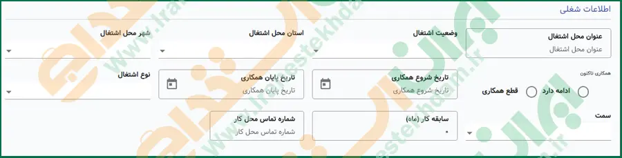 این بخش مربوط به اطلاعات سوابق شغلی است که لازم است اطلاعاتی نظیر عنوان محل اشتغال، وضعیت اشتغال، استان و شهر محل اشتغال و.. را وارد نمایید.