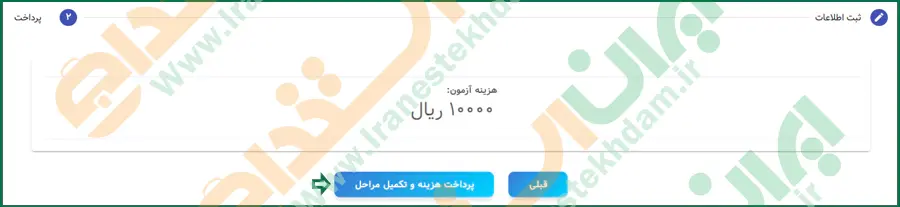 در این مرحله هزینه ثبت نام آزمون برای شما نمایش داده میشود که برای تکمیل روند ثبت نام، روی دکمه "پرداخت هزینه و تکمیل مراحل" کلیک نمایید.