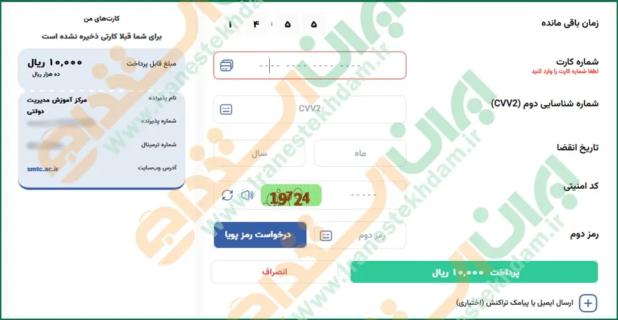 پس از کلیک روی گزینه پرداخت هزینه و تکمیل مراحل به درگاه پرداخت اینترنتی منتقل میشوید که لازم است پس از وارد کردن اطلاعات بانکی خود، روی گزینه "پرداخت" کلیک نمایید.