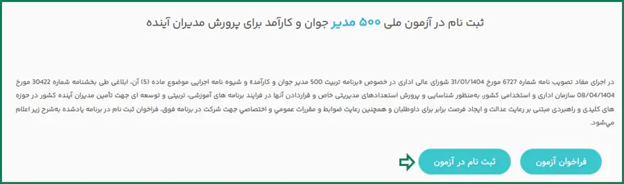 به منظور سهولت در ثبت نام آزمون فراخوان جذب مدیران جوان، تیم ایران استخدام لینک مستقیم ورود به صفحه فراخوان جذب مدیر دستگاههای اجرایی را در ادامه صفحه قرار داده است.