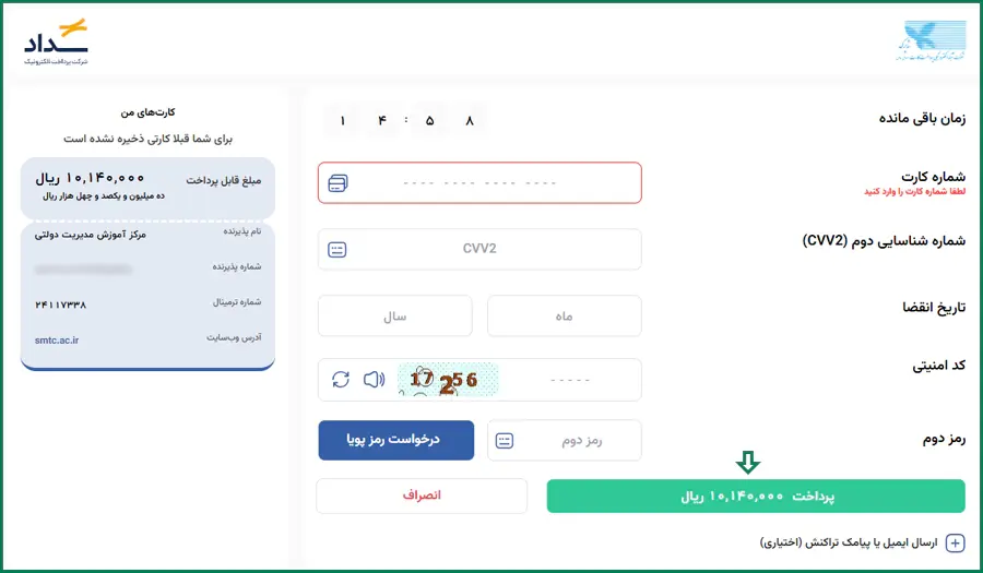 پس از کلیک روی گزینه پرداخت هزینه به درگاه پرداخت اینترنتی منتقل میشوید که لازم است پس از وارد کردن اطلاعات بانکی خود، روی گزینه "پرداخت" کلیک نمایید.