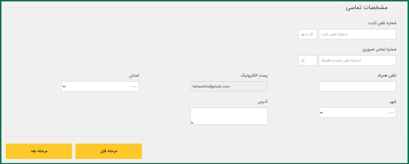 این مرحله مربوط به اطلاعات تماس است که باید مواردی مانند شماره تلفن ثابت، پست الکترونیک، استان و.. را وارد نمایید.