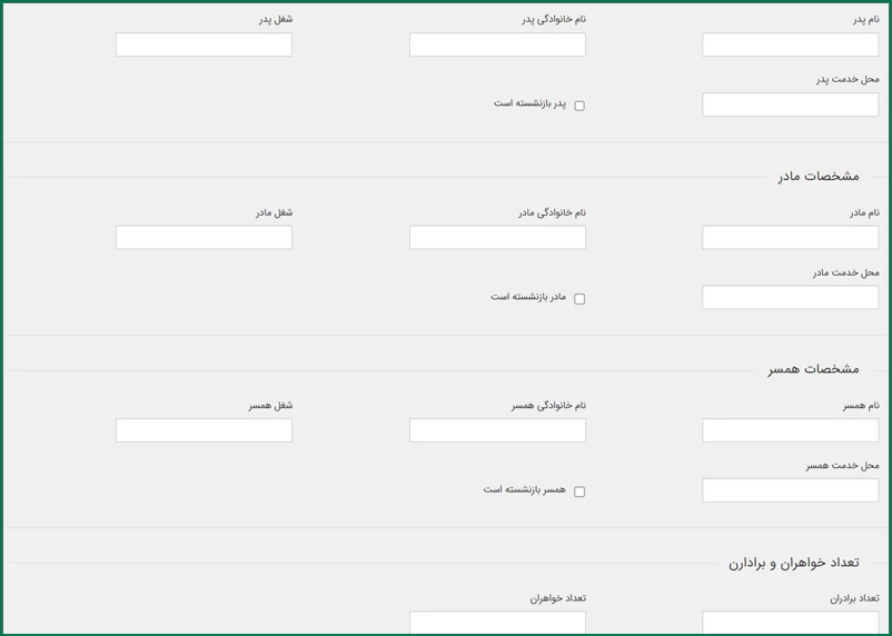 در این مرحله میتوانید مشخصات اعضای خانواده، از جمله نام و نامخانوادگی پدر، شغل و سایر اطلاعات مربوطه را وارد نمایید.