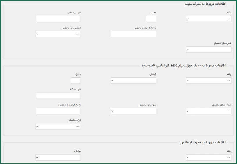 این مرحله مربوط به اطلاعات تحصیلی است و باید جزئیات مربوط به مدارک دیپلم و کارشناسی را وارد کنید. در صورت داشتن مدرک کارشناسی ارشد نیز اطلاعات آن را ثبت نمایید.