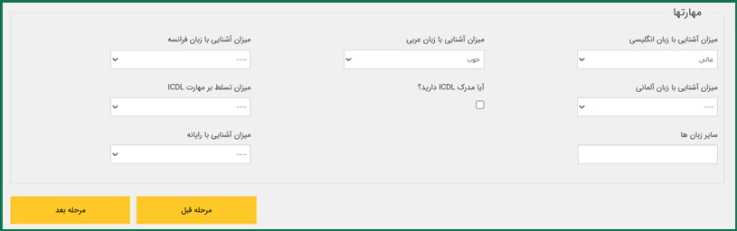 در این مرحله مهارتهای فردی خود مانند میزان آشنایی با زبانهای خارجی، رایانه و تسلط بر ICDL را وارد نمایید.