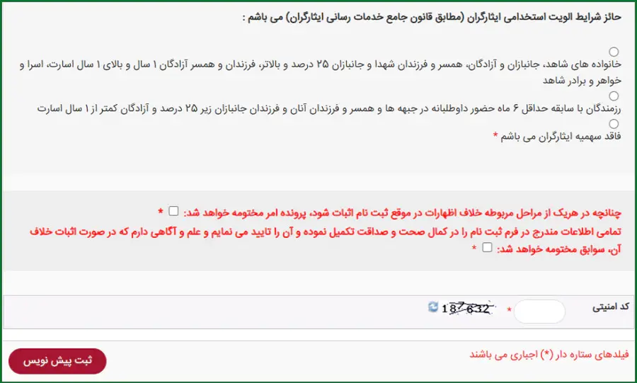این بخش مربوط به سهمیهها میباشد و باید گزینه مورد نظر را بر حسب شرایط خود انتخاب نمایید. سپس کد امنیتی نمایش داده شده را وارد کرده و روی دکمه "ثبت پیشنویس" کلیک نمایید.