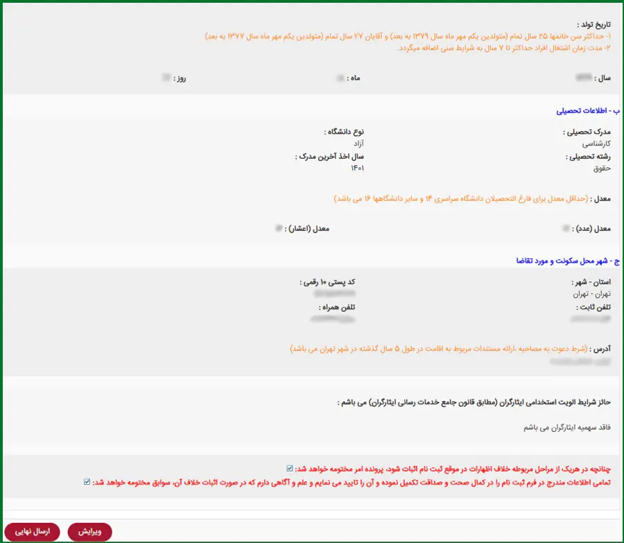 در این مرحله، پیش نمایش اطلاعات وارد شده نمایش داده میشود. در صورت تأیید صحت اطلاعات، روی گزینه "ارسال نهایی" کلیک نمایید.