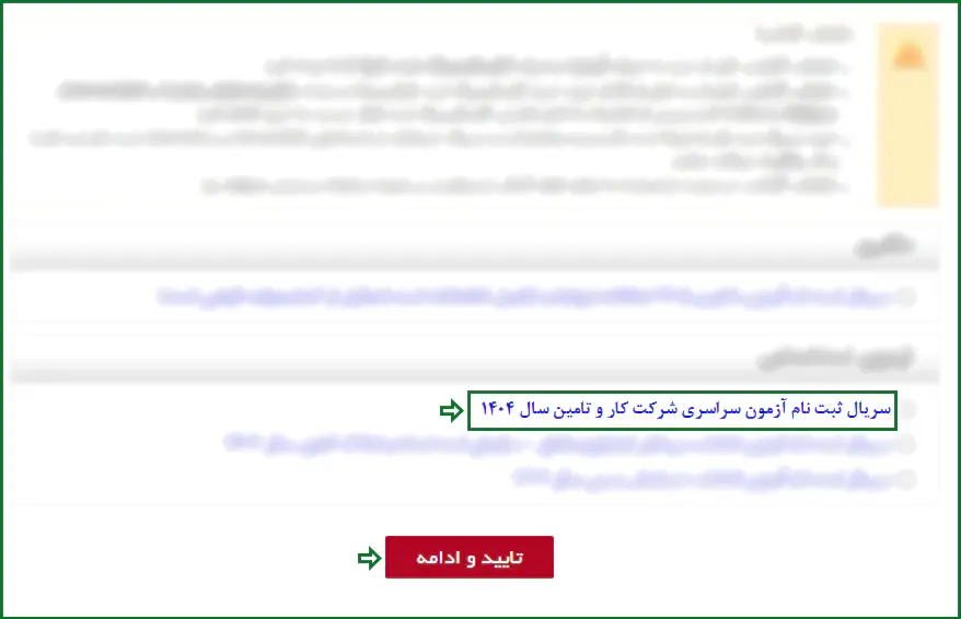 در این مرحله باید از میان گزینههای موجود، گزینه "سریال ثبت نام آزمون سراسری شرکت کار و تأمین سال ۱۴۰۴" را انتخاب کرده و سپس روی دکمه "تأیید و ادامه" کلیک نمایید.