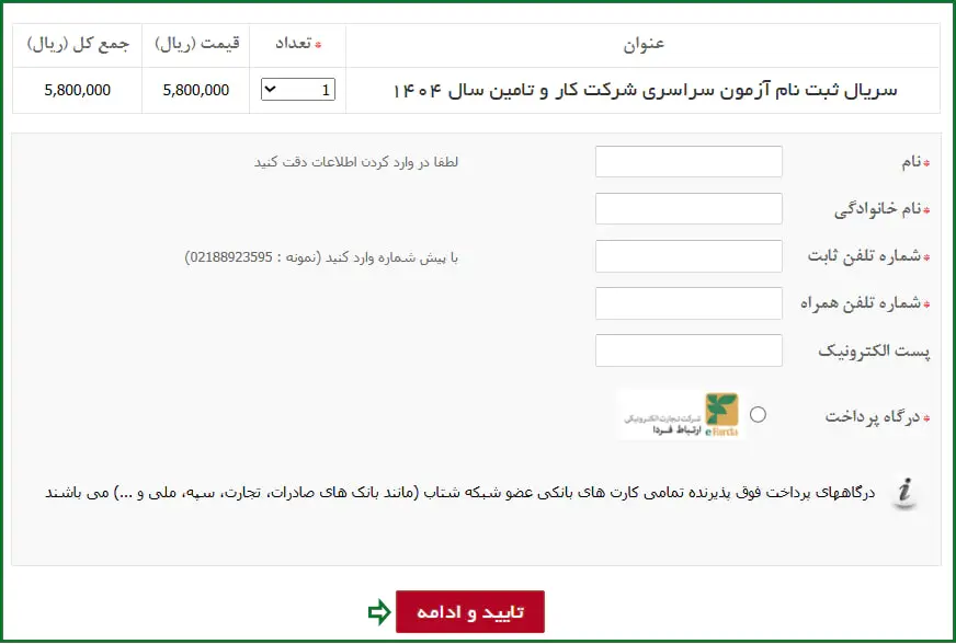 در ان مرحله باید اطلاعاتی نظیر نام و نام خانوادگی، شماره تلفن ثابت، شماره تلفن همراه و پست الکترونیک را وارد کنید. سپس درگاه پرداخت را انتخاب کرده و روی دکمه "تأیید و ادامه" کلیک نمایید.