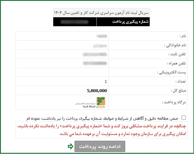 در این قسمت، پیش نمایشی از اطلاعات ثبت شده در مرحله قبل نمایش داده میشود که لازم است شماره پیگیری را یادداشت کرده و سپس روی دکمه "ادامه روند پرداخت" کلیک نمایید.