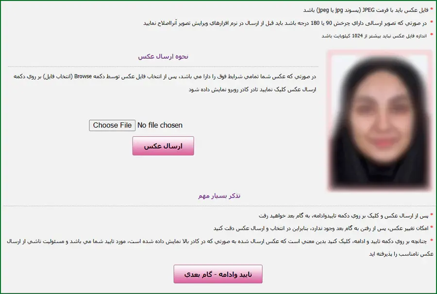 در این مرحله، شرایط مربوط به بارگذاری عکس را مطالعه کرده، سپس عکس پرسنلی خود را انتخاب کرده و روی دکمه "ارسال" کلیک نمایید.