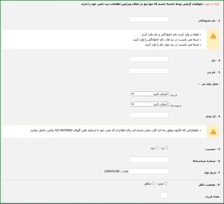 در این بخش، باید اطلاعات هویتی خود از جمله نام و نام خانوادگی، نام پدر، محل تولد، کد ملی و.. را وارد نمایید.