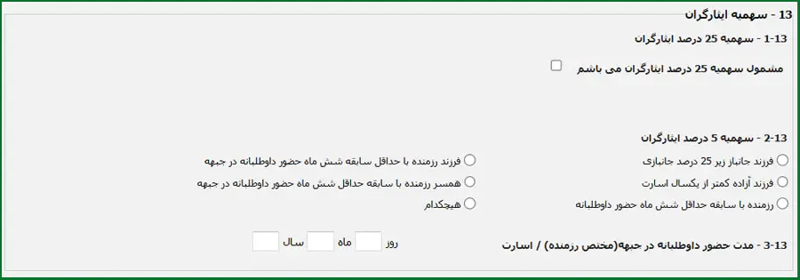این بخش مربوط به سهمیه ایثارگران است که در صورت داشتن سهمیه ایثارگری، یکی از گزینههای موجود را انتخاب نمایید و در صورت نداشتن سهمیه، تیک گزینه "هیچکدام" را بزنید.
