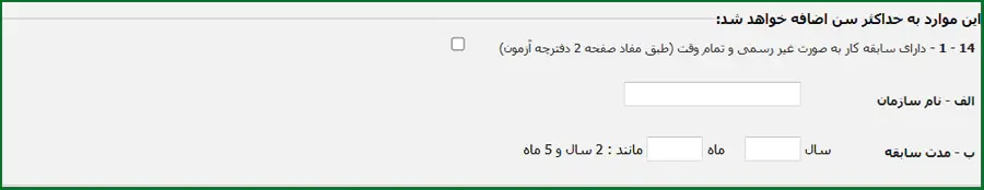 در این بخش، در صورتی که دارای سابقه کار غیررسمی یا تمام وقت در دستگاهها و سازمانهای دولتی هستید، باید گزینه مربوطه را فعال کرده و سپس نام سازمان محل خدمت و مدت سابقه کاری خود را وارد نمایید. توجه داشته باشید که این سابقه به حداکثر سن مجاز داوطلب اضافه خواهد شد.
