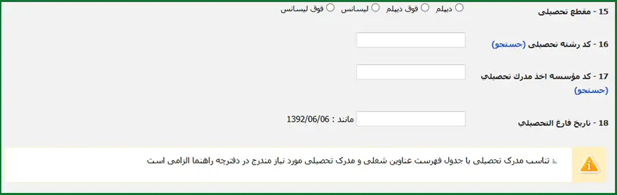 در این قسمت، مقطع تحصیلی خود را انتخاب کرده، سپس کد رشته تحصیلی، کد مؤسسه محل اخذ مدرک و تاریخ فارغ التحصیلی را وارد نمایید.
