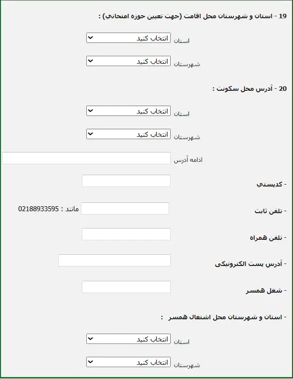 این بخش مربوط به اطلاعات محل سکونت است که باید مواردی مانند استان و شهرستان محل اقامت، آدرس کامل محل سکونت، کد پستی و.. را وارد نمایید.