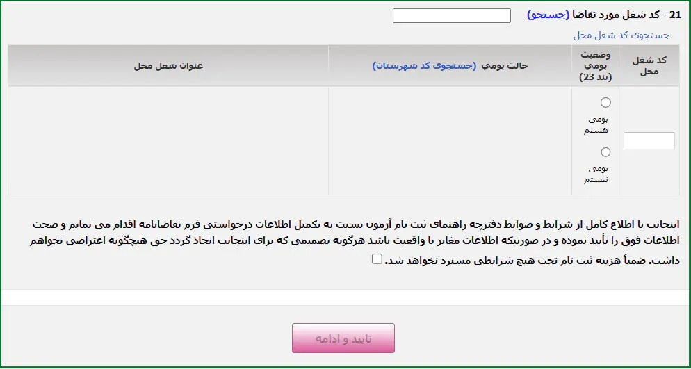 در این بخش، باید کد شغل مورد تقاضا را وارد کرده و وضعیت بومی بودن خود را مشخص نمایید. سپس پس از مطالعه و تأیید شرایط مندرج در دفترچه، گزینه تأیید را فعال کرده و در پایان روی دکمه "تأیید و ادامه" کلیک نمایید.