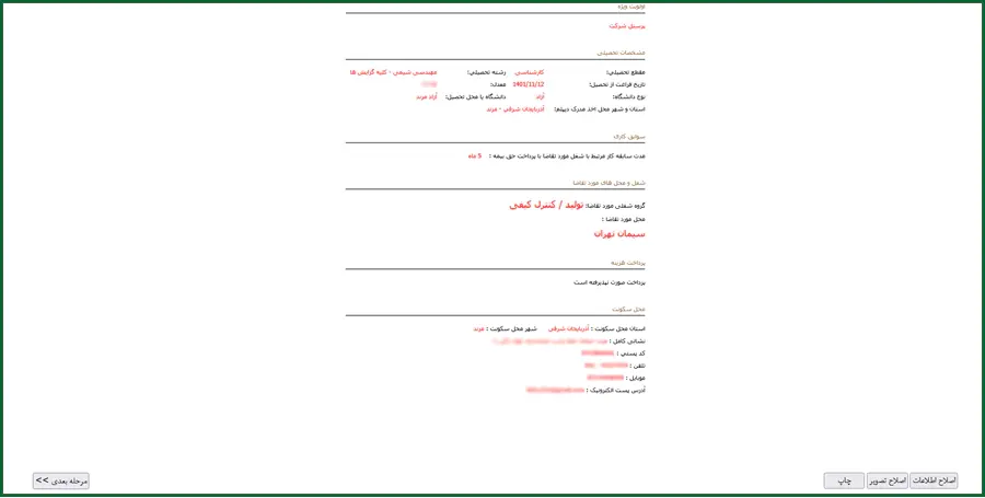 در این مرحله پیش نمایش اطلاعات ثبت شده نمایش داده میشود که در صورت نیاز میتوانید از طریق گزینه "اصلاح اطلاعات" آن را ویرایش کنید.