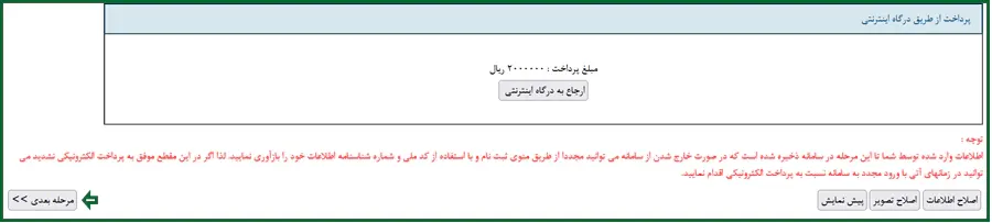 در این مرحله روی دکمه "ارجاع به درگاه اینترنتی" کلیک کرده و برای پرداخت هزینه ثبت نام وارد صفحه پرداخت بانکی شوید.