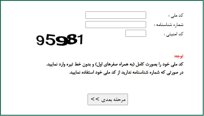 پس از کلیک روی دکمه مربوطه، صفحه ای مشابه تصویر زیر نمایش داده می شود که در آن باید اطلاعاتی مانند کد ملی، شماره شناسنامه و کد امنیتی را وارد نمایید.